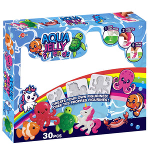 • Ensemble d'aqua gel pour fabriquer des amis en gelé • Activité facile et amusante • Ensemble créatif complet • Inclus : (3) bouteilles de brillant, (7) bouteilles de couleurs, (12) moules différents et de la poudre à mélanger • Non salissant • Pour les 5 ans et plus