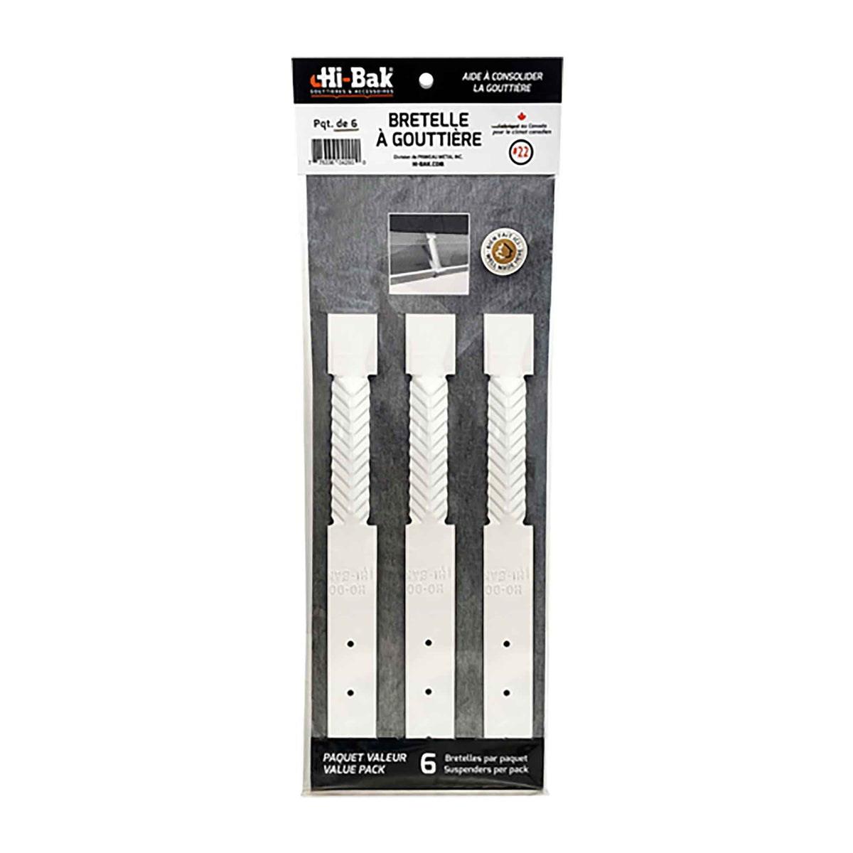 • HI-BAK gutter suspenders are used to secure or reinforce your gutters to the roof • They fit easily under the shingles • They are ideal for sloped roofs or roofs with ice buildup problems • A pack of 6 suspenders is recommended for every 10' of gutter length • Color: white • Packaging of 6 units