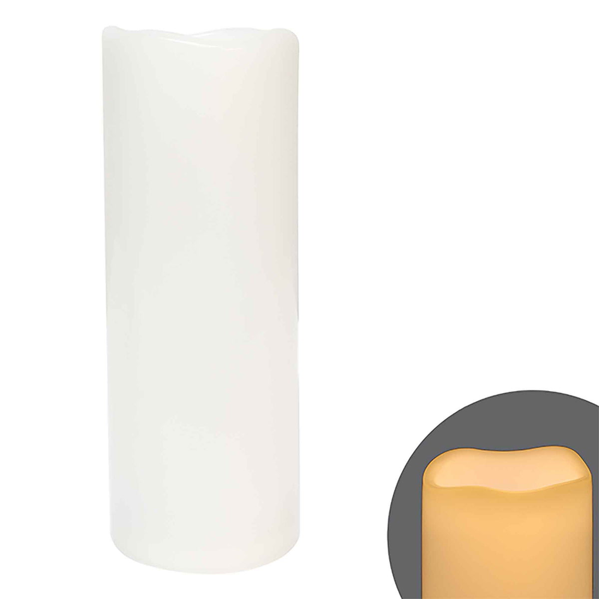 • Candle with flickering flame effect • For use indoors or outdoors • 5 hour timer function • LED lifespan of 10,000 hours • Requires 3 AAA batteries (not included) • Dimensions (Dia x H): 3'' x 4'' (7.62 cm x 20.32 cm)