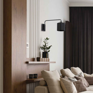 • Elegant and unique wall sconce with fabric shade • The swing arm allows you to control the direction of the light • Rocker switch located on the canopy • Bulb required: 1 x 60 W medium base (sold separately) • Color / finish: black • Dimensions (W x D x H): 6.25" x 19.50" x 9.38"