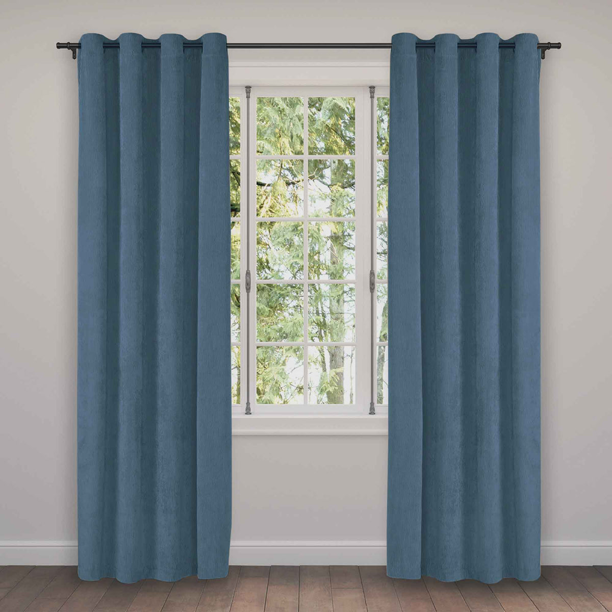 • Corduroy curtain panel with grommets • Machine washable on a delicate cycle • Color: blue • Dimensions (W x L): 54" x 96" • Panel sold individually