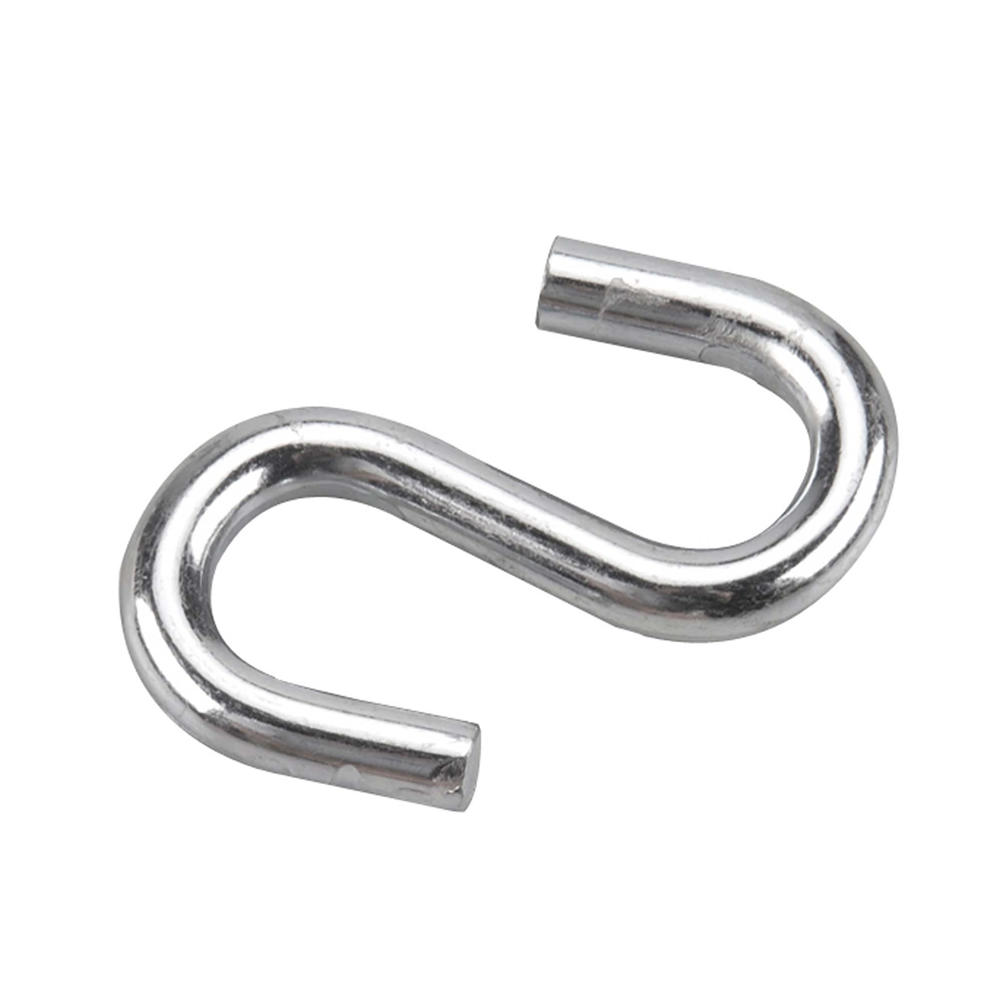 • This multipurpose S-hook can be opened or closed using pliers to secure hanging content • The S-shape allows for even weight distribution • Works best with chain, rope or cable • Material: metal • Safe working load: 176 kg • Color: zinc • Length: 64 mm • Width: 19 mm • Diameter: 7.6 mm